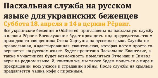 Alle ukrainske flygtninge i Odsherred inviteres til påskegudstjeneste i Rørvig Kirke lørdag 18. april kl. 14. Gudstjenesten forestås af sognepræst Sten Hartung og vil blive celebreret på russisk. Gudstjenesten er ikke en ortodoks gudstjeneste, men en tillempet evangelisk gudstjeneste, som så blot fejres på russisk. Påskeevangeliet vil blive læst og deltagerne vil også få mulighed for at bede med på Fader vor og trosbekendelsen på deres modersmål. Der vil også være enkelte musikalske indslag som f.eks. den ukrainske national- sang. Og naturligvis vil vi også bede for fred og ophør af alle krigens rædsler og lidelser. Efter gudstjenesten bydes på kaffe og kage i Rørvig Præstegårds konfirmandstue, Herthavej